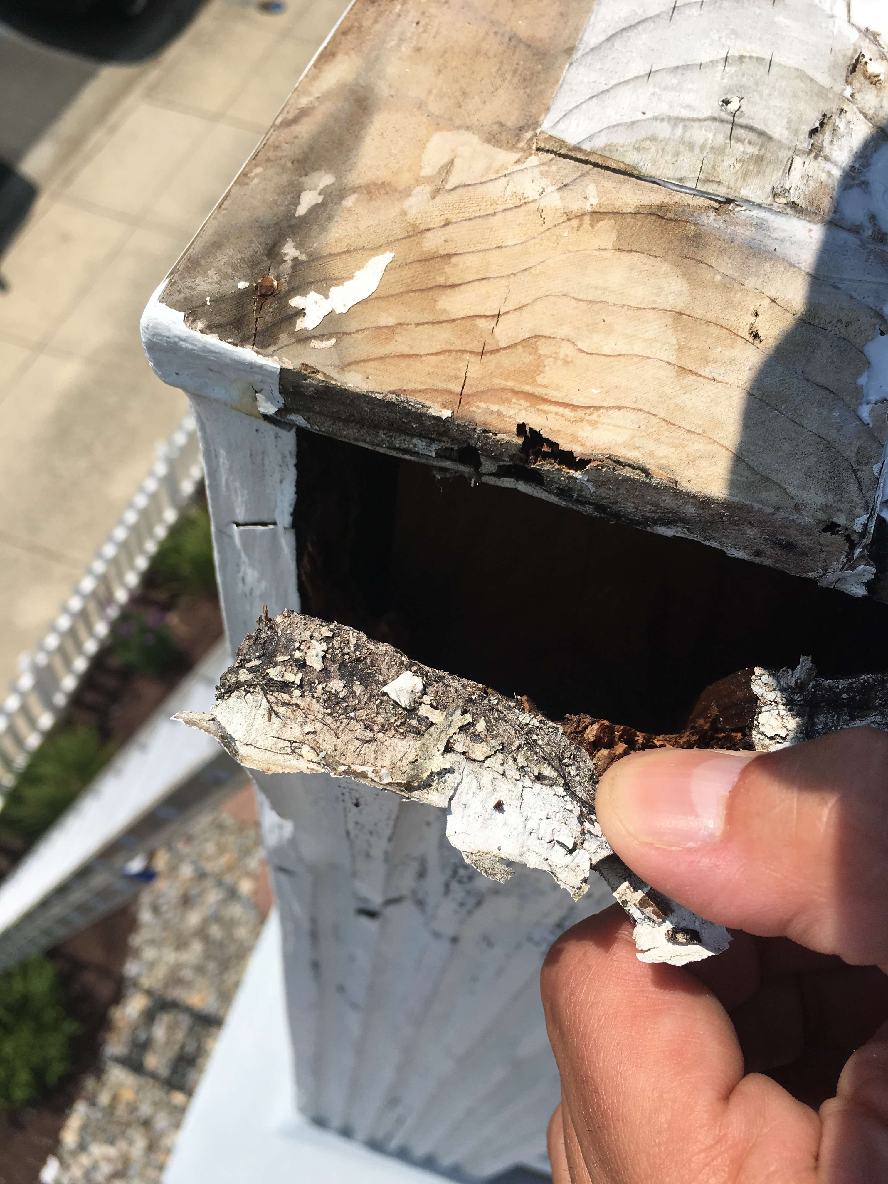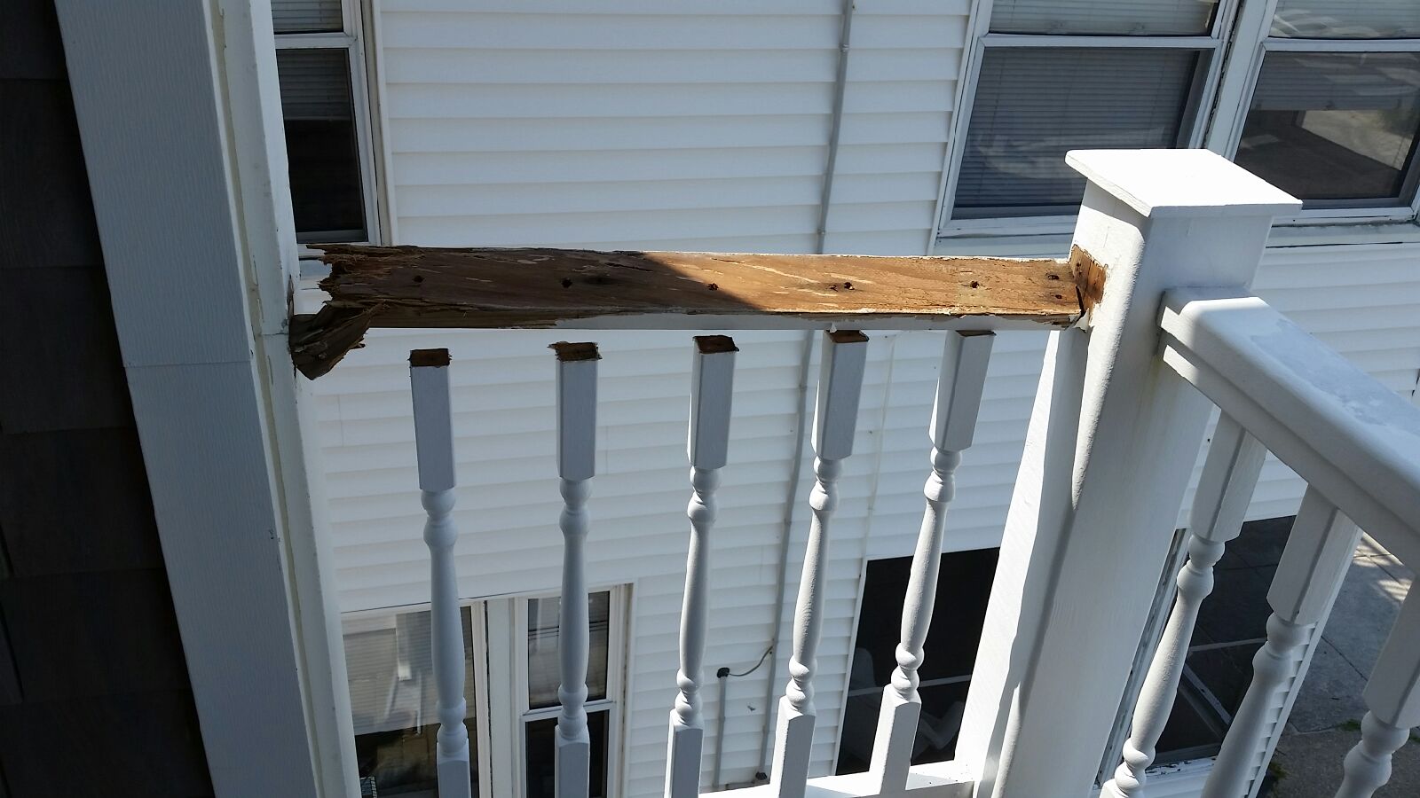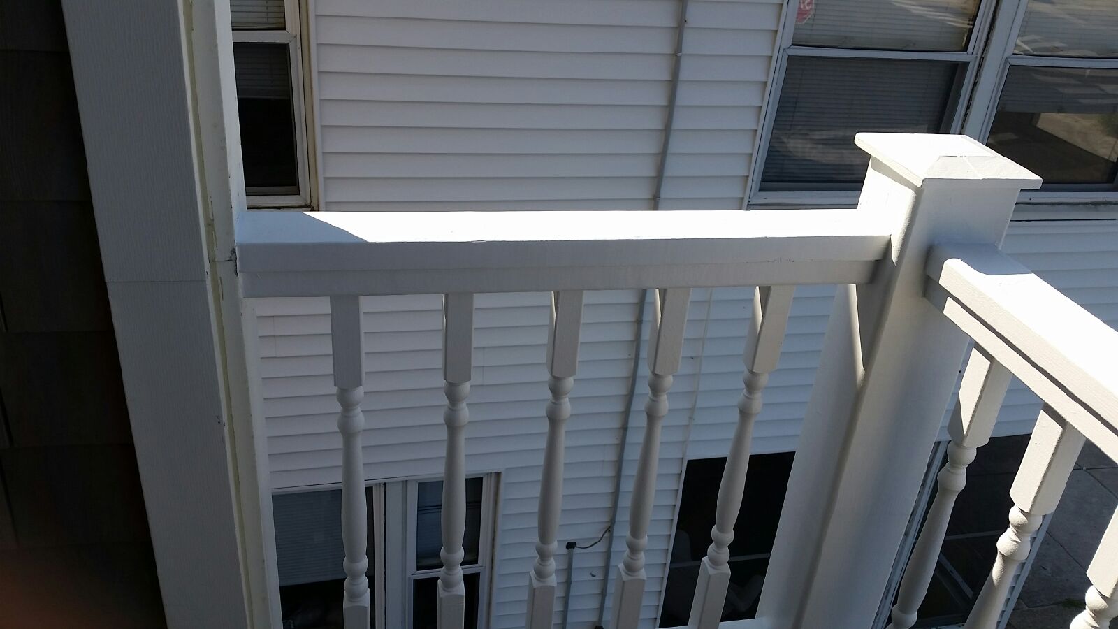 A railing and post on the second floor deck were both beginning to rot. Our skilled team of carpenters pulled out the damaged pieces and installed new ones to match. Next, the railing and post got a coat of white semi-gloss paint to match the existing woodwork.